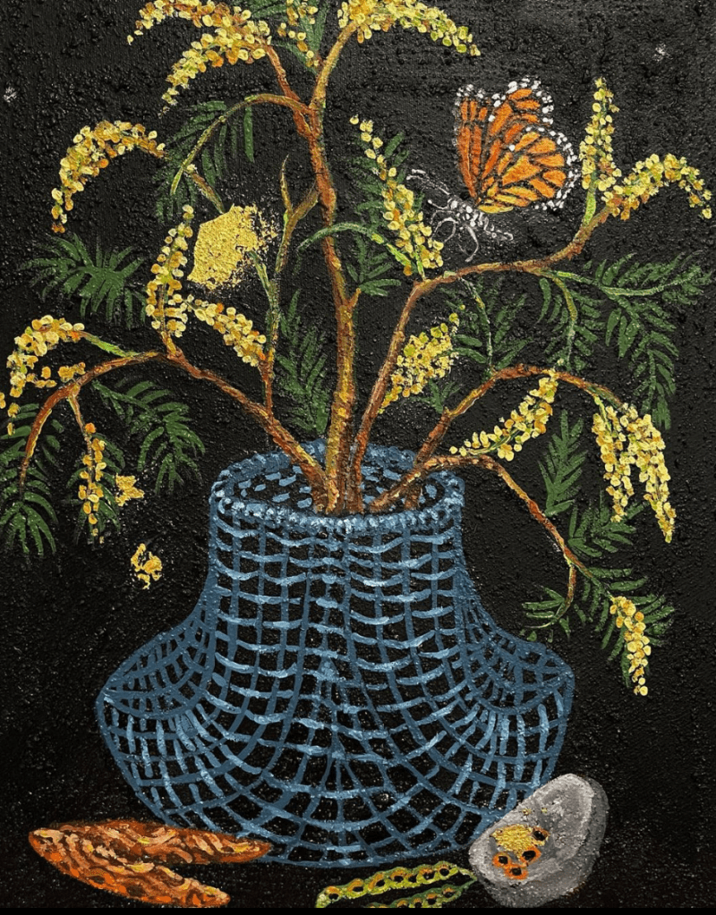 Often exhibiting bright tones contrasted against a darker background, much of Deanne’s bold and evocative works also depict the medicine and healing plants used by Aboriginal matriarchal women and ancestors, “thus creating a space for healing to take place through my art.”
